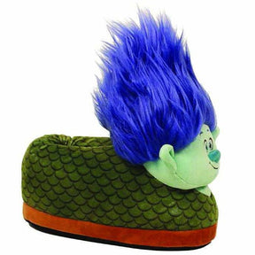 This sad blue haired troll may not understand the positivity of the rest of the trolls, but that doesn't mean he won't keep your feet warm this winter! Bring him home and spread the joy of the holiday season! 100% Polyester material, 1 Inch foam rubber and non-skid bottoms.