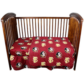 The officially NCAA licensed Florida State Seminoles baby crib set from College Covers is a perfect addition for any fan's nursery, whether for a baby girl or boy. This 4-piece set includes a reversible comforter, two fitted sheets, and a bed skirt, all crafted to bring team spirit to your little one's room.