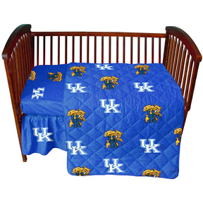 The officially NCAA licensed Kentucky Wildcats baby crib set from College Covers is a perfect addition for any fan's nursery, whether for a baby girl or boy. This 4-piece set includes a reversible comforter, two fitted sheets, and a bed skirt, all crafted to bring team spirit to your little one's room.