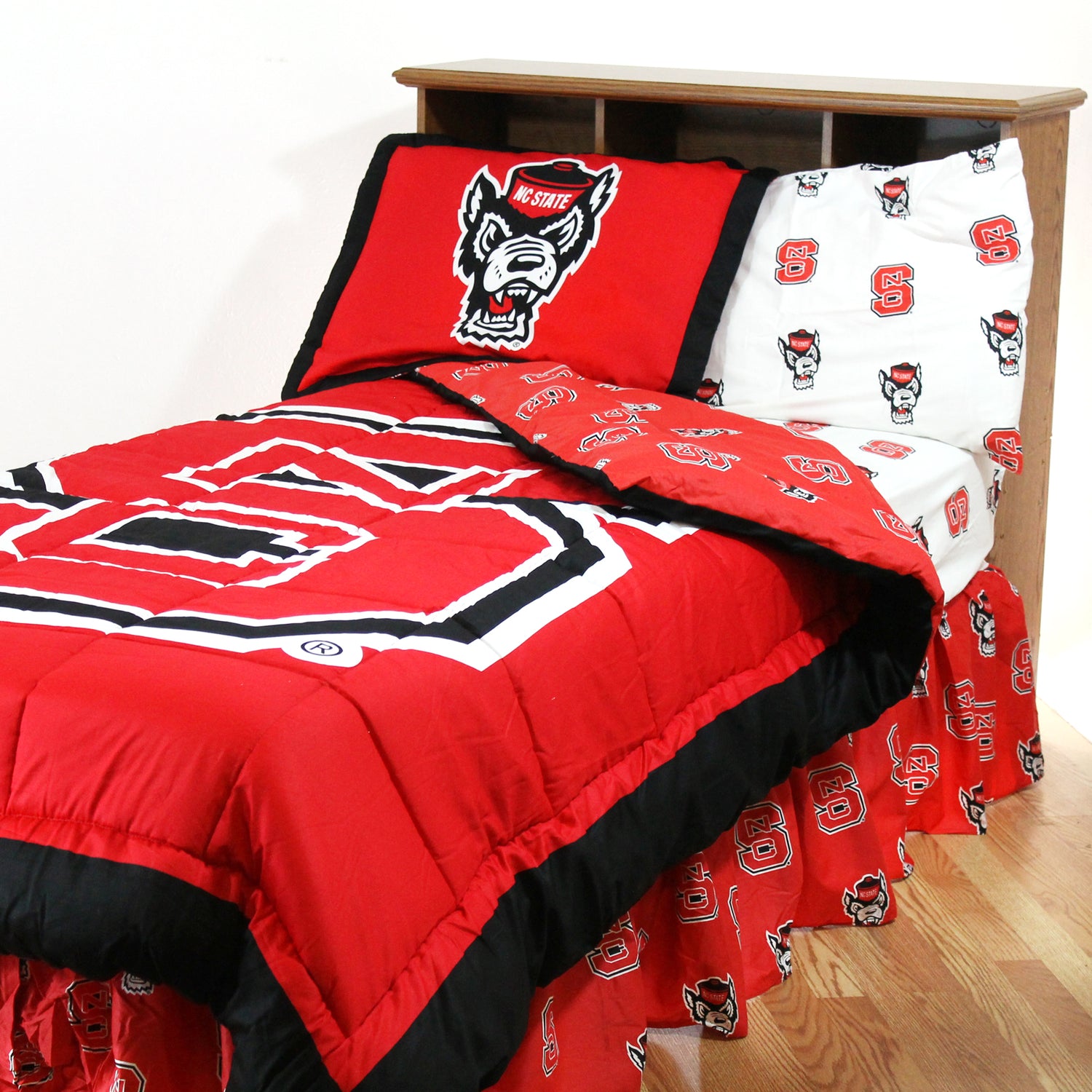 NC State Wolfpack licensed, College Covers branded bed in a bag includes everything you might need to decorate a team themed bedroom. The comforter is quilted to eliminate the poly fill from bunching. Our 100 percent cotton, 200 thread count bedding is machine washable. We recommend to use a oversized commercial washer and dryer to wash and dry to eliminate any fabric rubbing on the sides, this could potentially cause problems. Wash in cold water with like colors and tumble dry on a low heat. Imported.