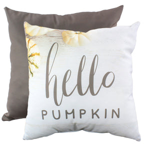 Hello Pumpkin in taupe lettering against a rustic photo background, with a contrasting dark taupe back. This 16" decorative pillow is a great fall décor piece. Made in the USA.