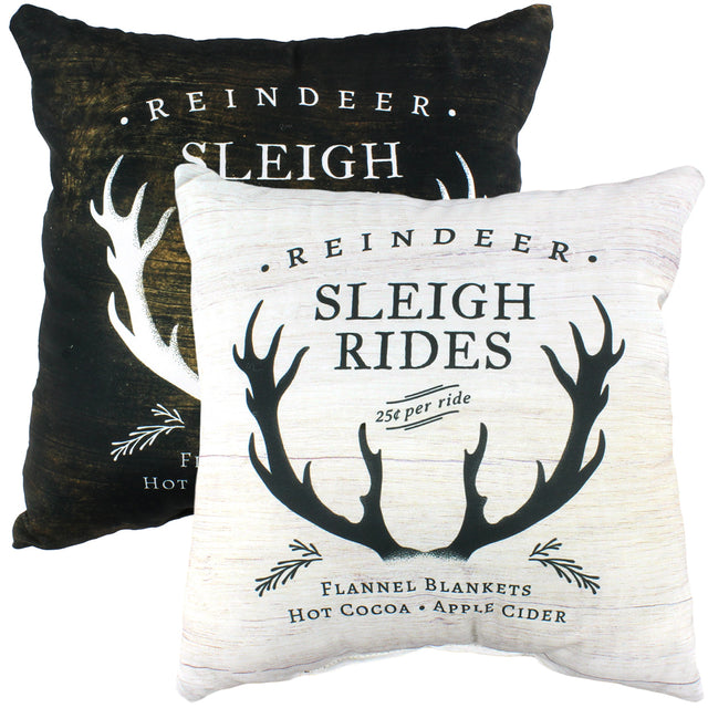 Reindeer Sleigh Rides, 25¢ A Ride. Vintage design against contrasting rustic wood backgrounds. This reversible 16" decorative pillow is a great winter décor piece. Made in the USA.