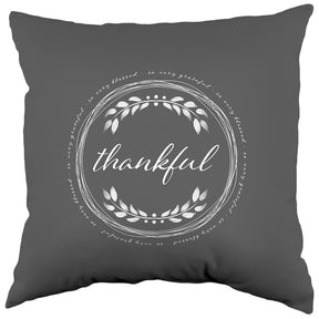 "So very grateful. So very blessed." script wreath. "Thankful" double sided Fall throw pillow with decorative foliage, available in multiple colors.