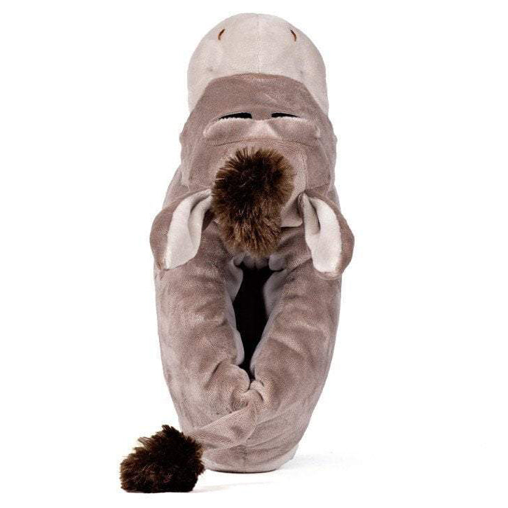 Our super comfy donkey slippers will have you singing and dancing around the house! This funny looking donkey is ready to make your feet happy with his furry slippers. Who wouldn't want to keep their feet warm in these lovable donkey slippers! 100% Polyester material, 1 Inch foam rubber and non-skid bottoms.