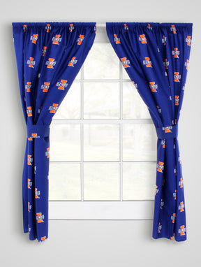 These 63-inch curtain panels are made and licensed by College Covers. This curtain panel set includes two 42" x 63" curtain panels with two matching tiebacks, all you need to fully decorate 1 window. Curtain panels have a 2” rod pocket and 2” header, complete with all over printing done in officially licensed team colors and logos. These 63" long curtain panels match perfectly to our curtain valance, sold separately. Made with 100% cotton sateen, 200 thread count then pigment for a long lasting color. These curtains are machine washable in cold water and tumble dry on low heat.