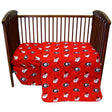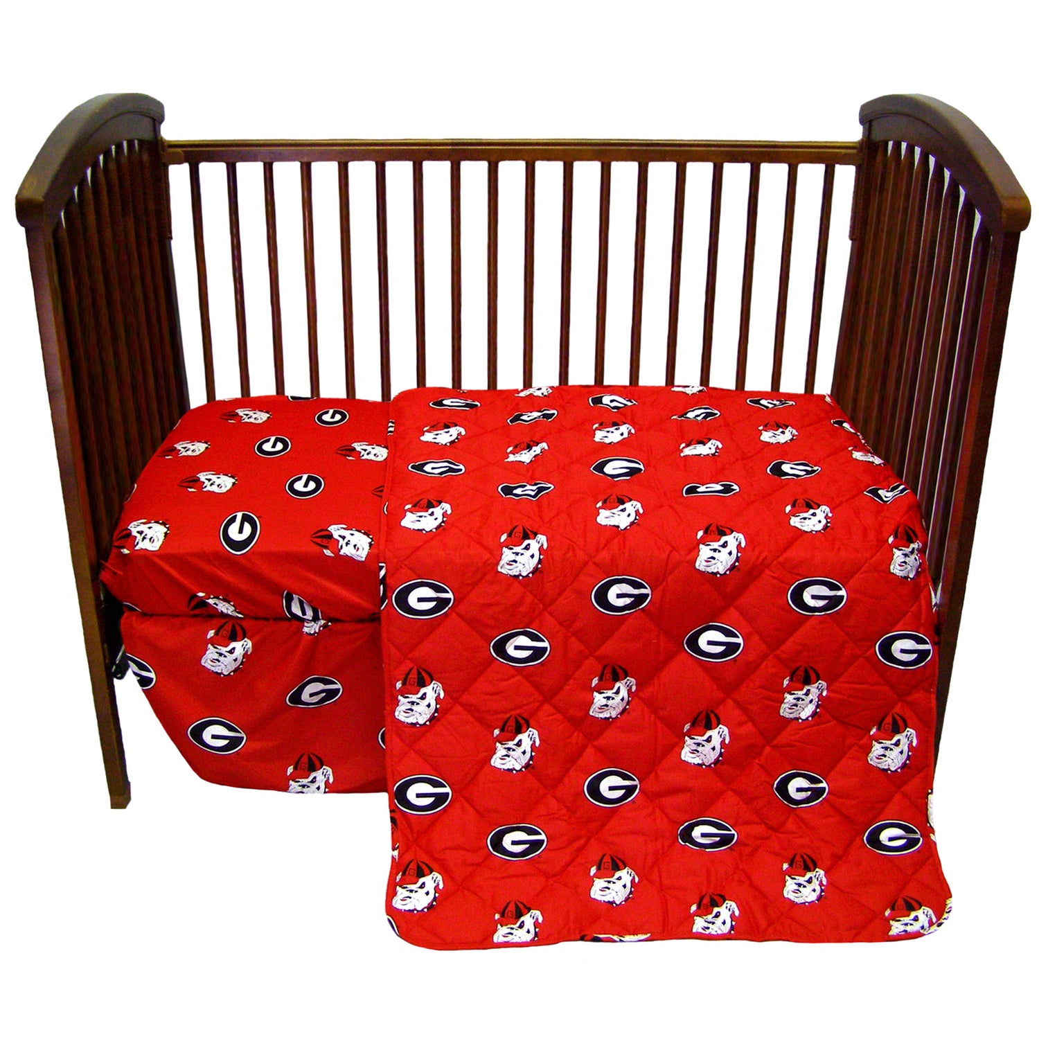 The officially NCAA licensed Georgia Bulldogs baby crib set from College Covers is a perfect addition for any fan's nursery, whether for a baby girl or boy. This 4-piece set includes a reversible comforter, two fitted sheets, and a bed skirt, all crafted to bring team spirit to your little one's room.