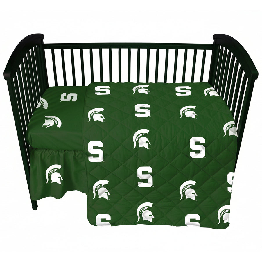 The officially NCAA licensed Michigan State Spartans baby crib set from College Covers is a perfect addition for any fan's nursery, whether for a baby girl or boy. This 4-piece set includes a reversible comforter, two fitted sheets, and a bed skirt, all crafted to bring team spirit to your little one's room.
