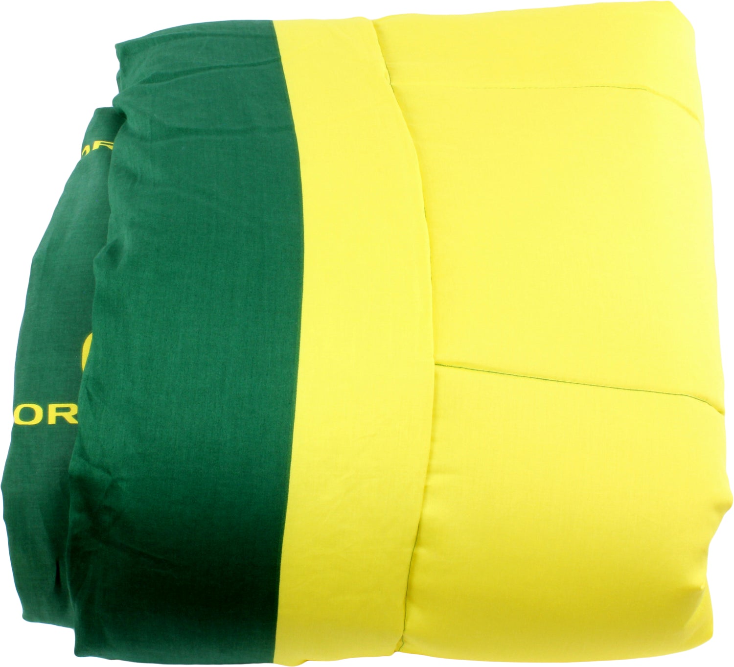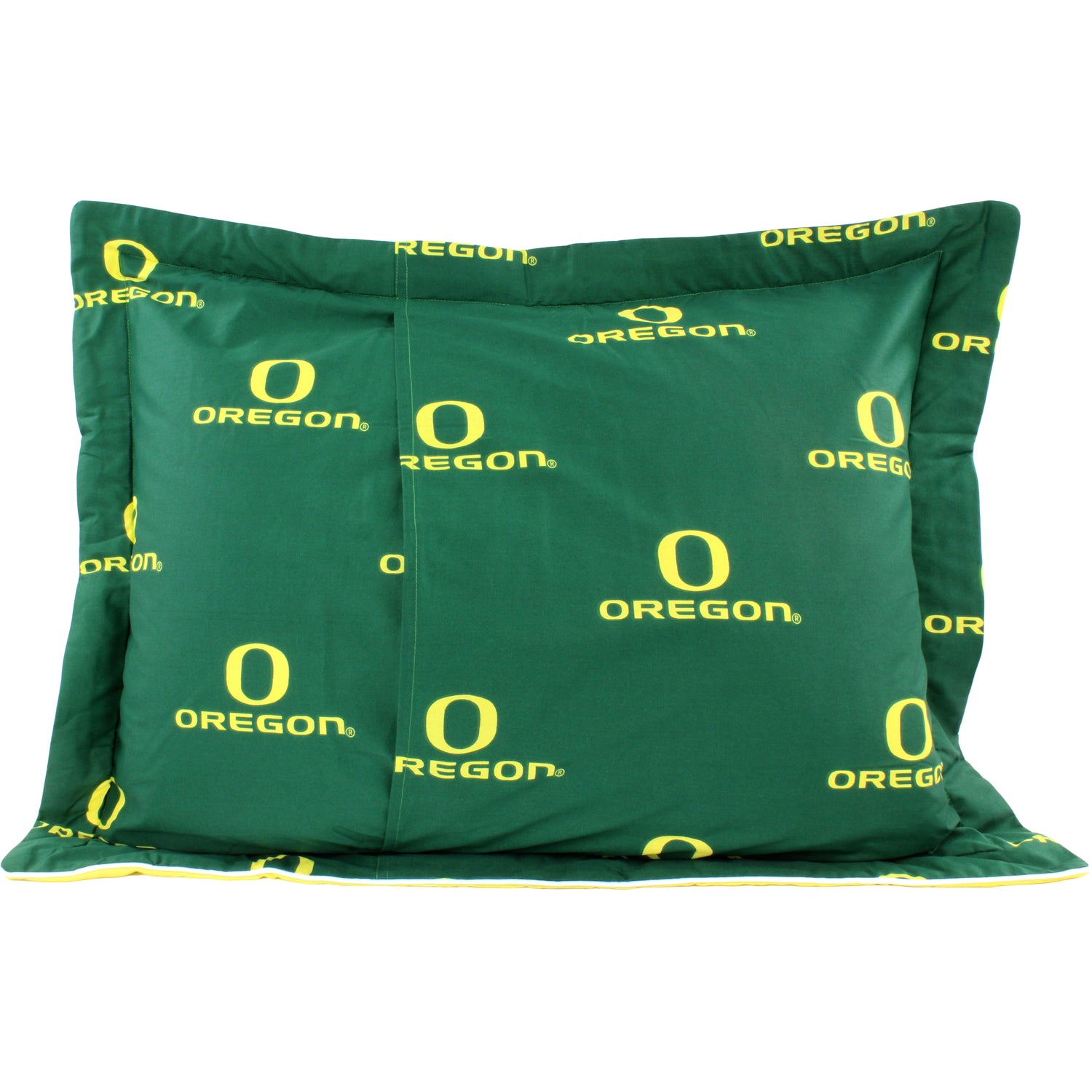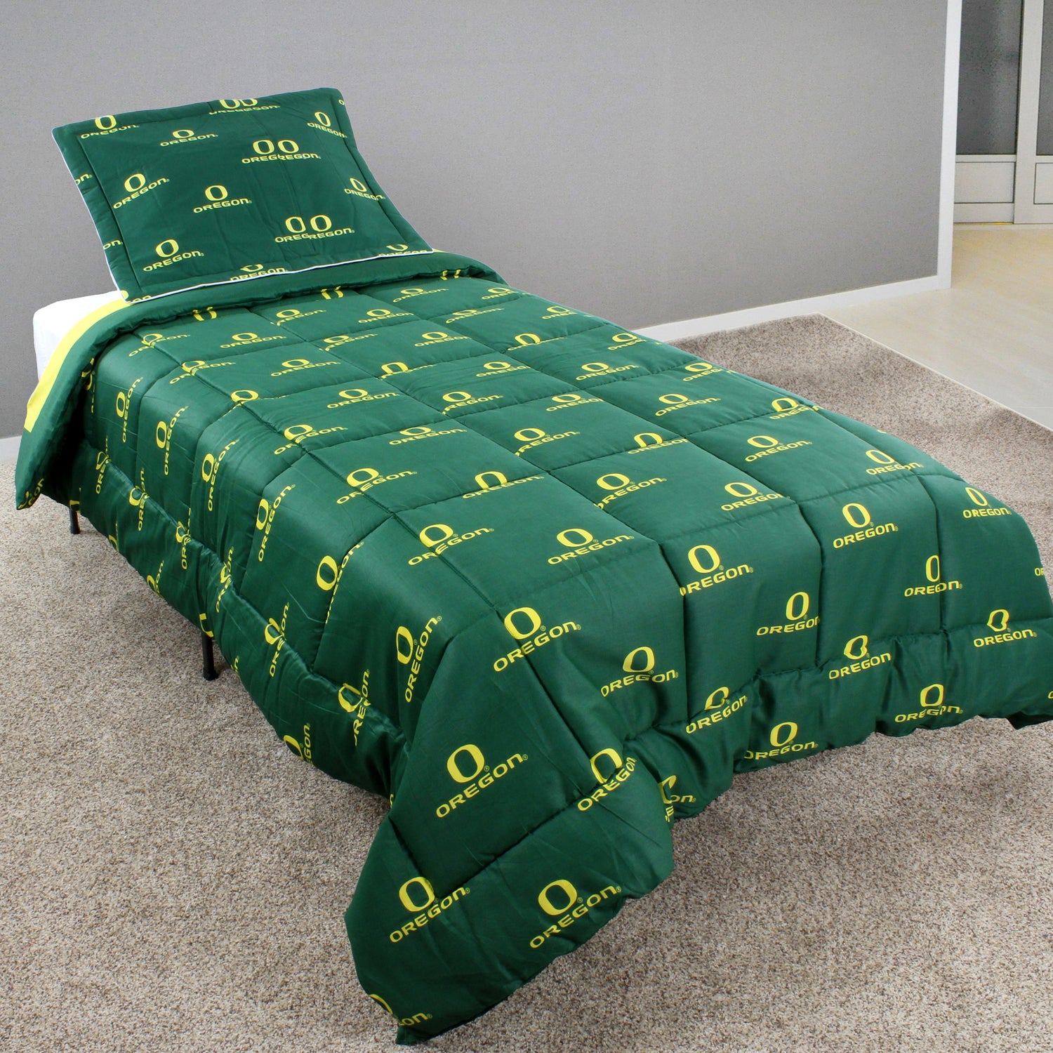 Oregon Ducks licensed, College Covers branded comforter set includes everything you might need to decorate a team themed bedroom. Our sheet sets and dust ruffles are also available, but not included in this set. The comforter is quilted to eliminate the poly fill from bunching. Our 100 percent cotton, 200 thread count bedding is machine washable. We recommend to use a oversized commercial washer and dryer to wash and dry to eliminate any fabric rubbing on the sides, this could potentially cause problems. Wash in cold water with like colors and tumble dry on a low heat.
