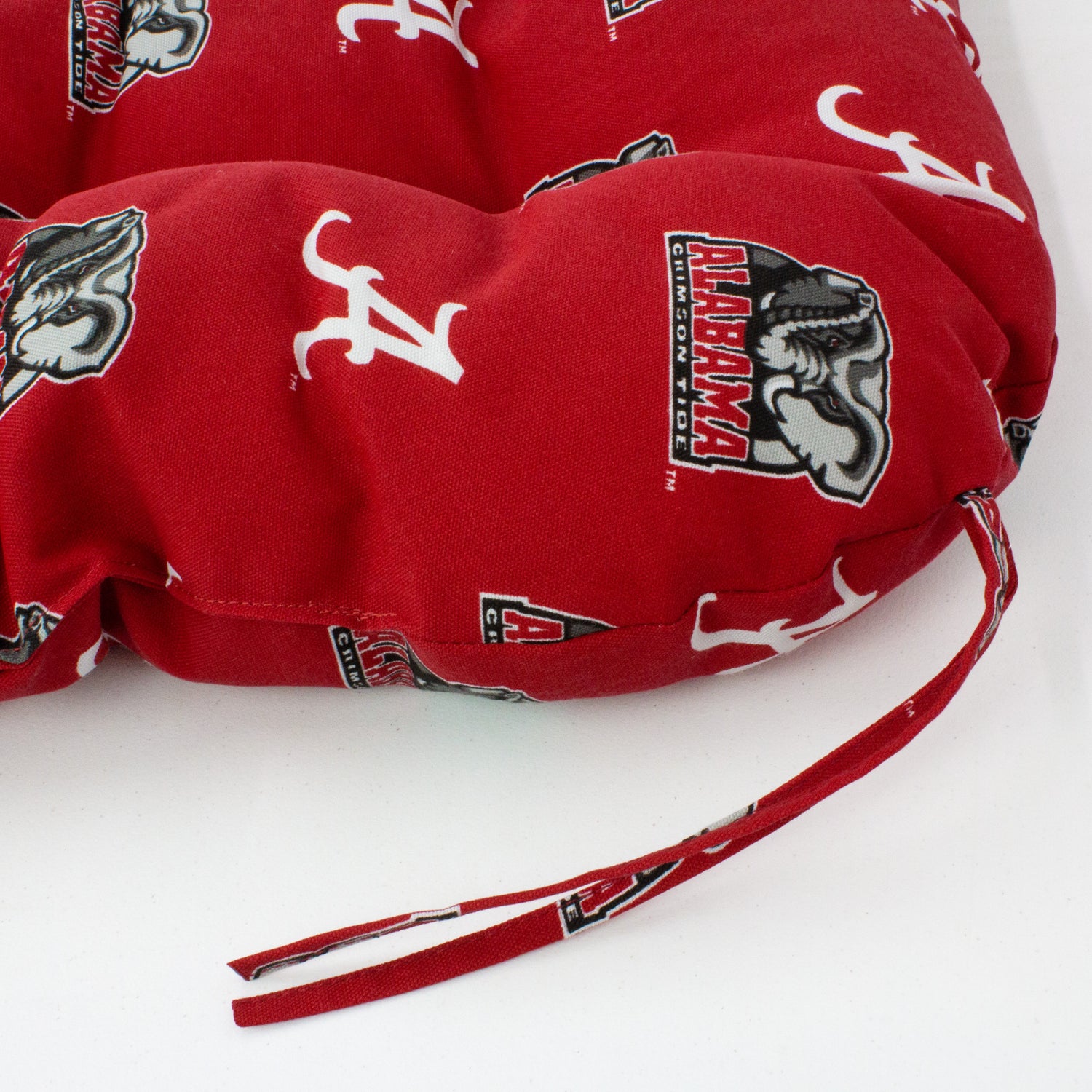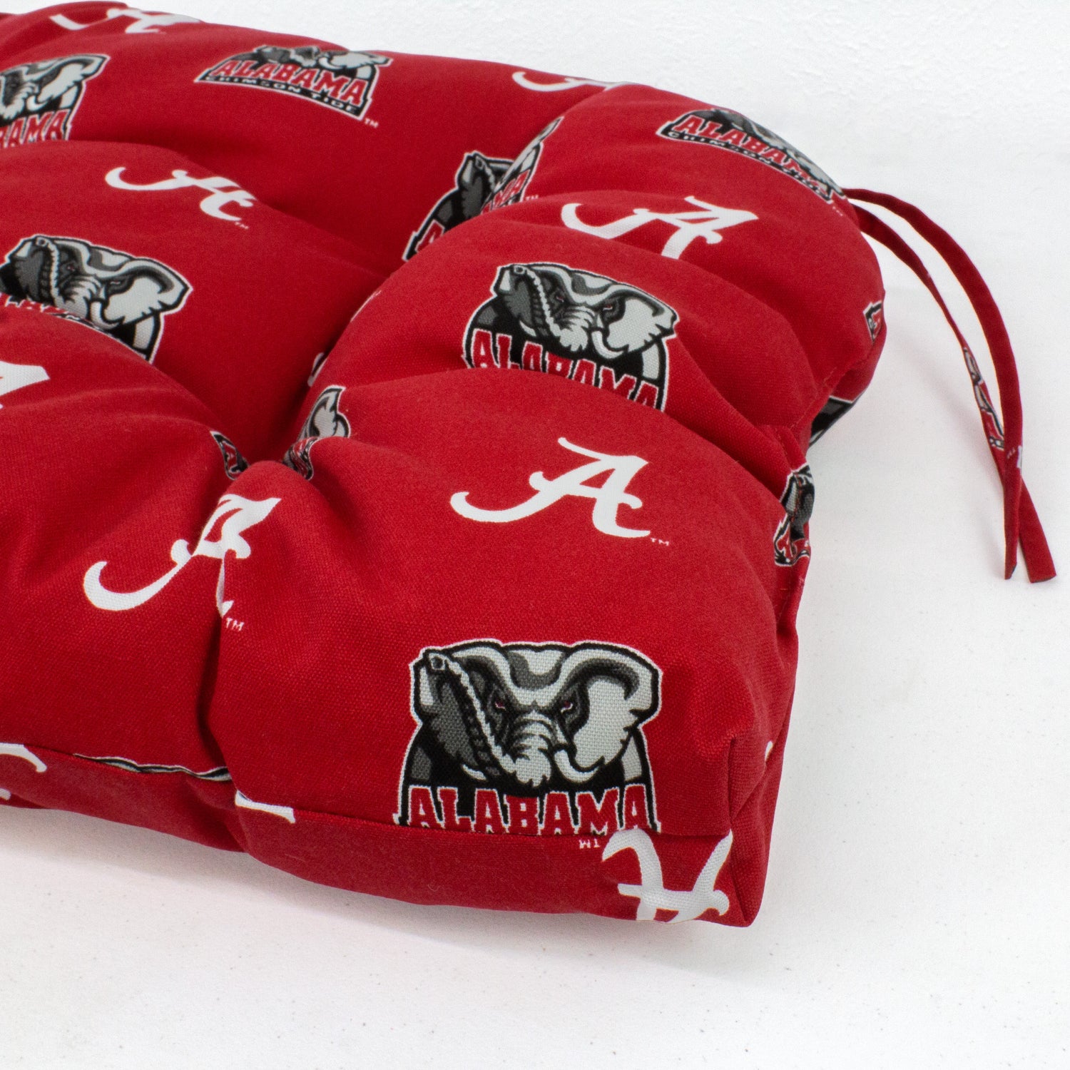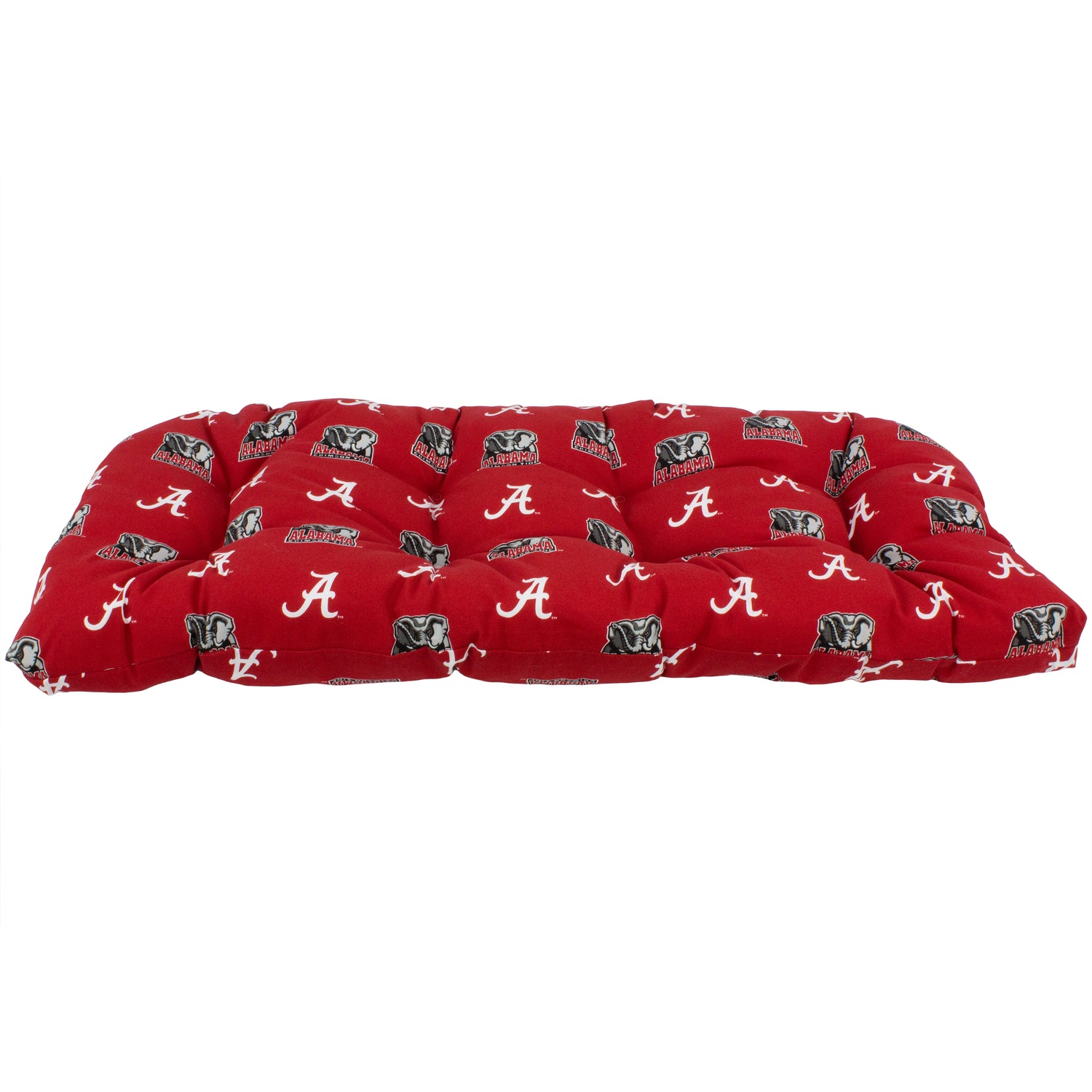 Our NCAA licensed settee cushion is a great addition to any patio settee chair. This settee cushion is made with UV-treated polyester to resist stains, mildew, weather, and fading in sunlight. Works great for both indoor or outdoor use. The seat cushion is filled with a 100-percent polyester fiber sourced from North Carolina and filled right here in Nebraska. Attached ties keep the settee seat cushion securely tied to your favorite settee chair, circle tacked to eliminate bunching of filling for a perfectly comfortable seat. Lightly spot clean or hand wash with a mild detergent and cool water, allow to air dry. Measures 46-inches long x 20-inches wide x 3-inches high. Does not include a chair, cushion only.