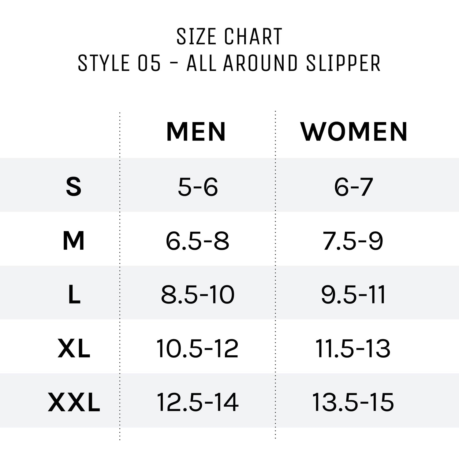 - These are slippers, so they are made to fit a range comfortably; they are not made to fit snug like shoes. Unisex slippers fit men's sizes: Small 5 to 6. Medium 6.5 to 8. Large 8.5 to 10. X-Large 10.5 to 12. XX-Large 12.5 to 14. Women's sizes: Small 6 to 7. Medium 7.5 to 9. Large 9.5 to 11. X-Large 11.5 to 13. XX-Large 13.5 to 15.