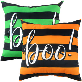Green "boo!" front, orange "boo!" back. This reversible 16" decorative pillow is a great Halloween décor piece. Made in the USA.