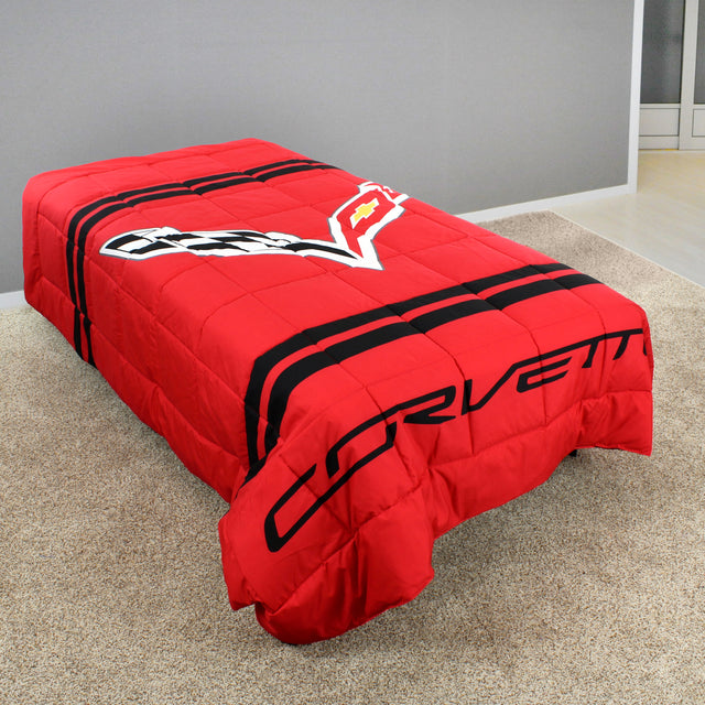 Corvette licensed, College Covers branded comforter set includes everything you might need to decorate a team-themed bedroom. Our matching sheet sets and pillows are also available, but not included. The comforter is quilted to eliminate the poly fill from bunching. Our 100 percent polyester bedding is machine washable. We recommend using an oversized commercial washer and dryer to wash and dry to eliminate any fabric rubbing on the sides, this could potentially cause problems. Wash in cold water with like colors and tumble dry on a low heat. Imported and officially licensed by Everything Comfy.