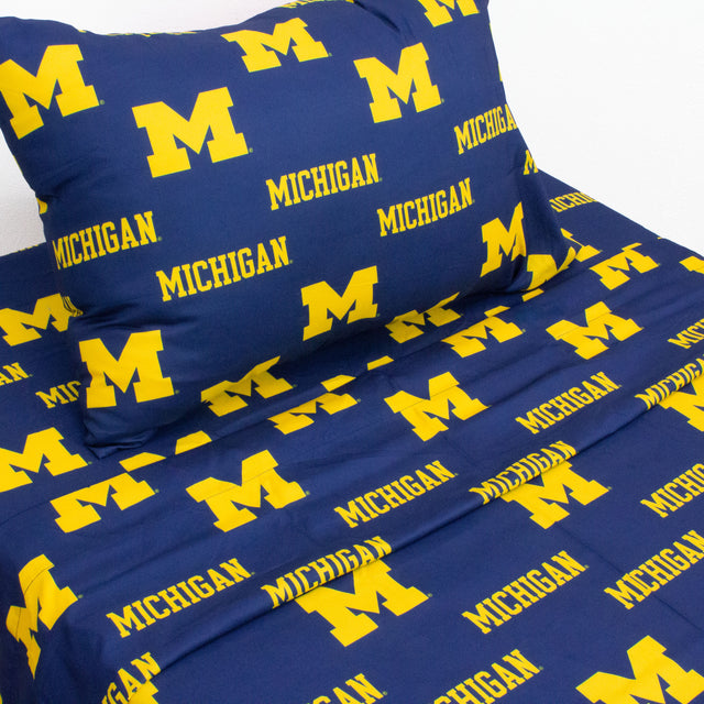 Michigan Wolverines licensed, College Covers brand sheet set. All made from 100 percent polyester material, our sheet sets are machine washable with like colors in cold water and should be tumble dried on a low heat. Imported.